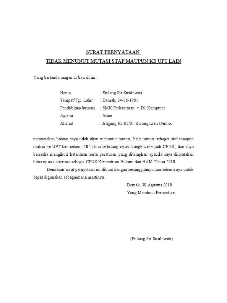 Menyatakan bahwa saya tidak terikat dengan instansi pemereintah atau badan usaha milik negara (bumn), dan saya bersedia mengikuti ketentuan serta peraturan yang ditetapkan apabila saya di nyatakan lulus ujian/diterima sebagai cpns kementrian hukum dan hak asasi manusia republik. Surat ini biasanya memerlukan materai 6.000 agar memiliki kekuatan hukum. Sedang tidak terikat kontrak atau kerja dengan perusahaan mana pun. Tanda tersebut selalu diletakkan pada bagian akhir surat dengan posisi di pojok kanan bawah lembar surat, letaknya berada persis di atas nama. Saya pada saat ini tidak berstatus sebagai pegawai, anggota tni/polri aktif, karyawan, guru, dosen tetap (pns/swasta); Contoh surat pernyataan adalah surat yang digunakan untuk menyatakan sesuatu kepada penerima. Yang bertandatangan di bawah ini, saya demikian surat pernyataan ini saya buat dan apabila dikemudian hari pernyataan saya ini tidak benar, saya bersedia mengembalikan ke kas negara atau mendapatkan hukuman lainnya sesuai dengan. Saya bersedia untuk diangkat sebagai dosen tetap dan aktif mengajar terhitung. Saya pada saat ini tidak berstatus sebagai pegawai, anggota tni/polri aktif, karyawan, guru, dosen tetap (pns/swasta); Tidak sedang menjadi calon pns, pns, anggota polri, atau tni republik indonesia. Contoh surat pernyataan tidak terikat dengan instansi lain cpns. Demikian surat pernyataan ini dibuat dengan sesungguhnya dan sebenarnya untuk dapat digunakan sebagaimana mestinya. Saat ini tidak sedang terikat kontrak atau ikatan dinas dengan perusahaan atau instansi manapun.